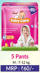 Pack – 5 Pants,Romaic Care Presents A gently-fitting tape-style baby diaper in Medium size, designed for newborns and small infants. The adjustable fit makes it easy to put on and take off, while the soft material ensures comfortable movement and secure coverage throughout the day. Ideal for everyday diapering needs.